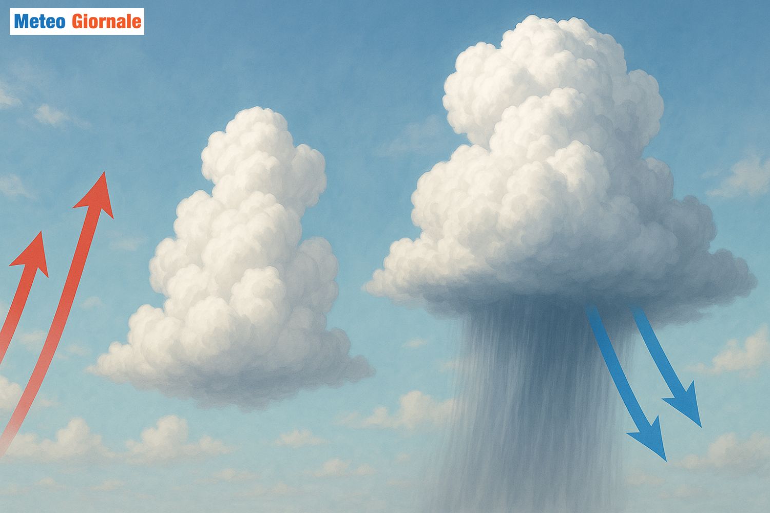 L’aria calda, essendo più leggera, inizia a salire rapidamente verso l’alto, come una bolla in una pentola d’acqua in ebollizione. Durante l’ascesa, si raffredda e si condensa in vapore acqueo, formando le nuvole. Questo movimento genera correnti ascendenti molto forti, simili a veri e propri ascensori atmosferici. Infatti, in meteorologia questo fenomeno è chiamato corrente ascensionale.