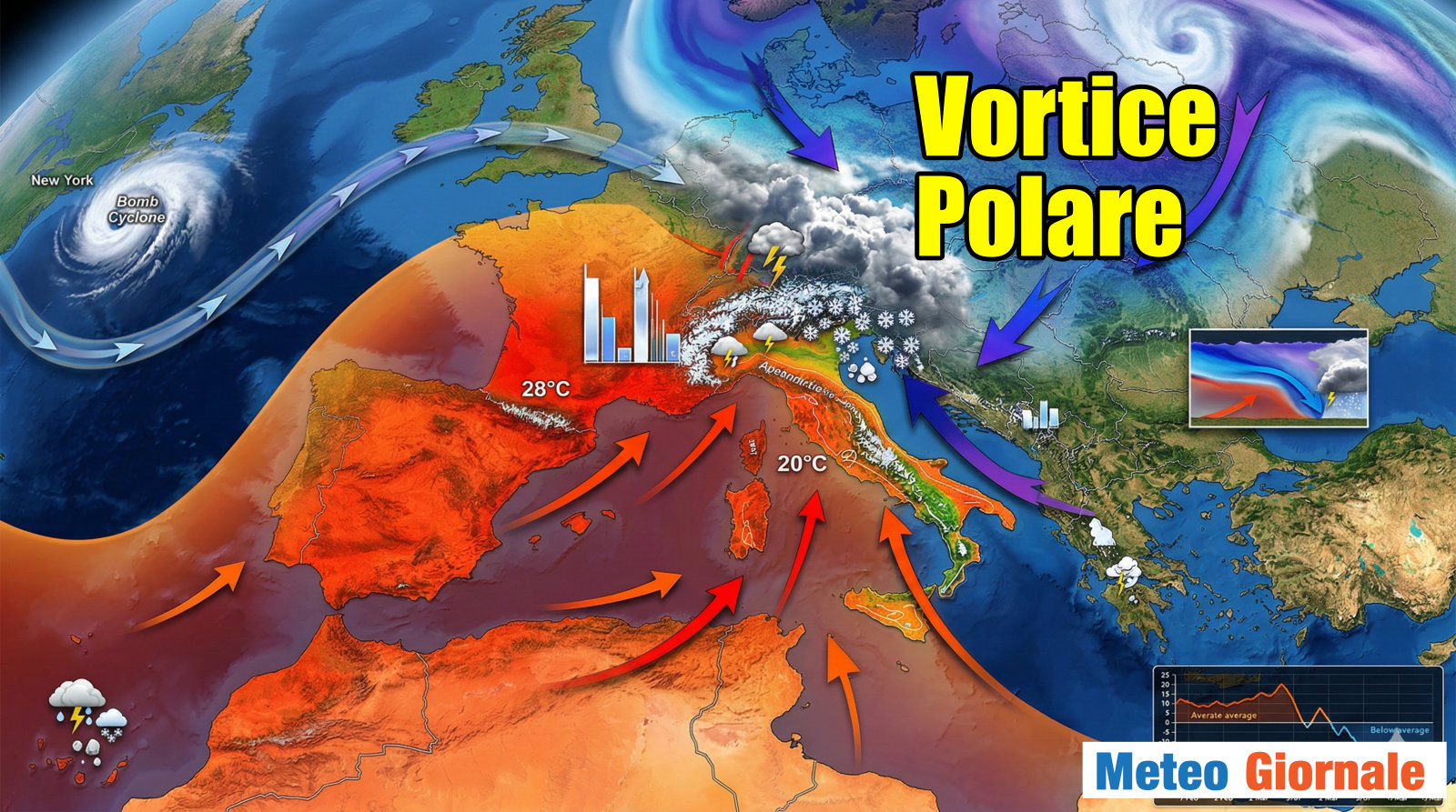 La neve in pianura appare improbabile, come opinione personale. Tuttavia è capitato di osservare, nei bollettini meteo automatici consultabili sullo smartphone, alcune località della Valle Padana con previsioni di neve e temperature diurne di 0 °C: il giorno successivo quella stessa giornata veniva prevista con il sole e massime anche di 17 °C, se non oltre. Questo racconta esattamente la caoticità che stiamo vivendo: un grande caos che non è fantascienza, ma realtà, innescato dal fatto che ci sono differenze di temperatura diverse rispetto al passato tra regioni polari e regioni tropicali. Ora che i tropici si stanno riscaldando, tali differenze si accentuano e si intensificano gli scambi di masse d’aria lungo i meridiani, ovvero da nord verso sud e da sud verso nord. Non sarebbe nemmeno accaduta, altrimenti, la grande tempesta di neve su New York con il suo ciclone bomba, ovvero un ciclone esplosivo. Ora è imminente una nuova nevicata su New York, dopodiché torneranno temperature miti. Ma New York è lontana: noi siamo in Italia, in Europa, e non abbiamo un clima così estremo.