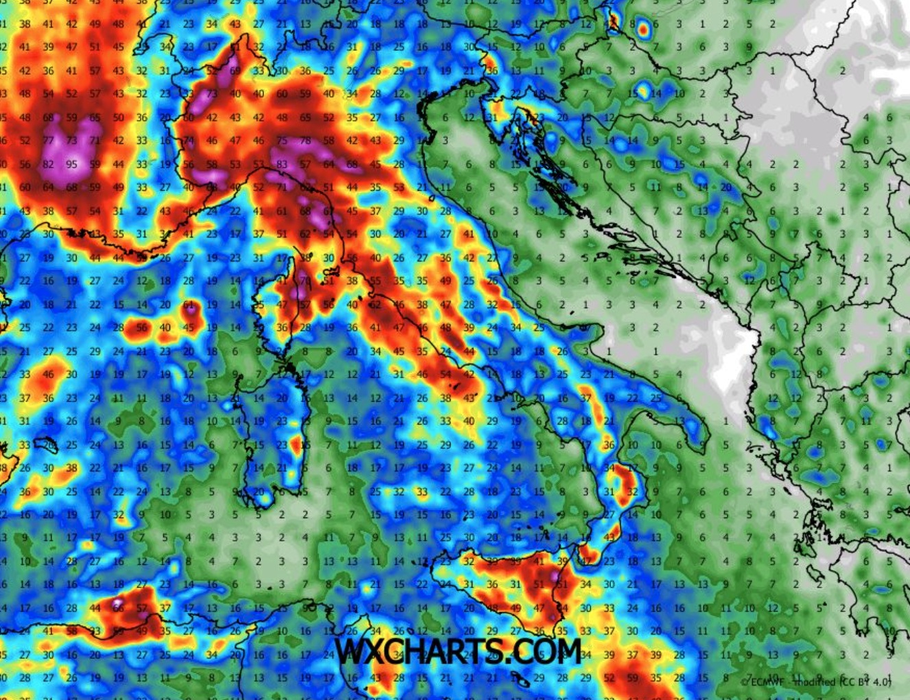Dando un’occhiata alle probabilità di precipitazioni, si nota dalla mappa la grande possibilità di pioggia nei prossimi 10 giorni. Come sempre, invitiamo gli attori alla cautela. Sono mappe statistiche, elaborano i dati meteorologici puntuali.