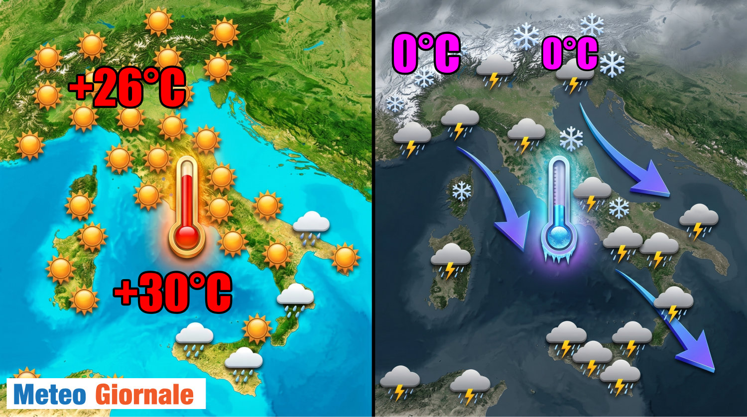 L’Italia, però, anche in questa circostanza non sembra essere direttamente coinvolta, come se fosse protetta da un caldo Mediterraneo. Tuttavia, questa situazione appare come una vera svolta, perché andrebbe a interferire in modo deciso sul tempo italiano, innescando condizioni atmosferiche favorevoli a una marcata instabilità, che si traduce ovviamente in fasi temporalesche e perturbate a carattere sparso.
