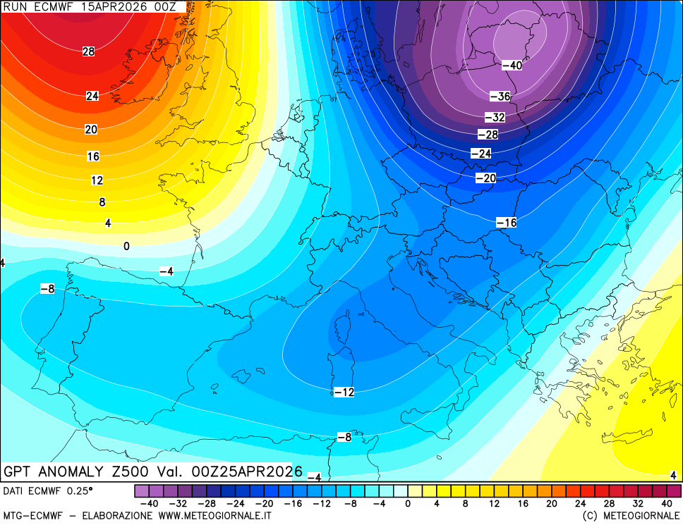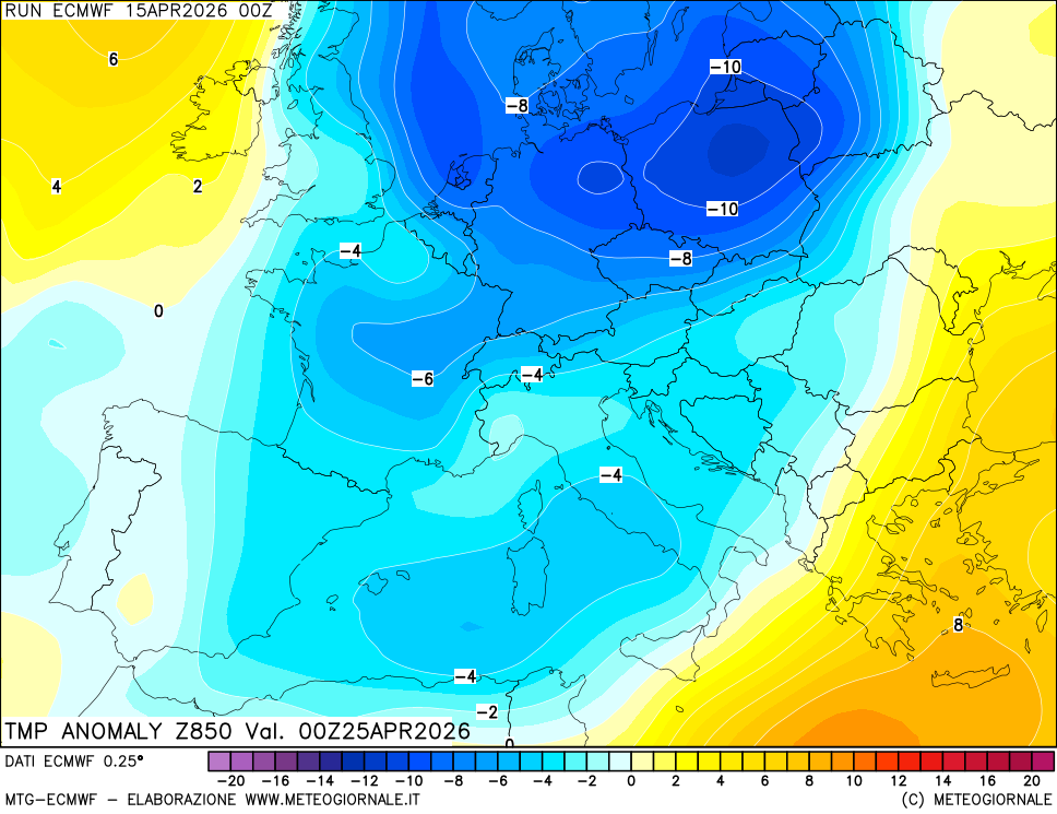 È da considerare anche che una fortissima espansione di aria fredda è prevista verso il 25 aprile sul centro-nord dell’Europa, con un Vortice Polare che interessa tutte le quote, da una bassa pressione in troposfera fino al livello del suolo, con un minimo barico nel Golfo di Botnia e un secondo minimo barico sul Golfo Ligure, vista l’intrusione di aria fredda che andrebbe ad appoggiarsi sull’arco alpino.