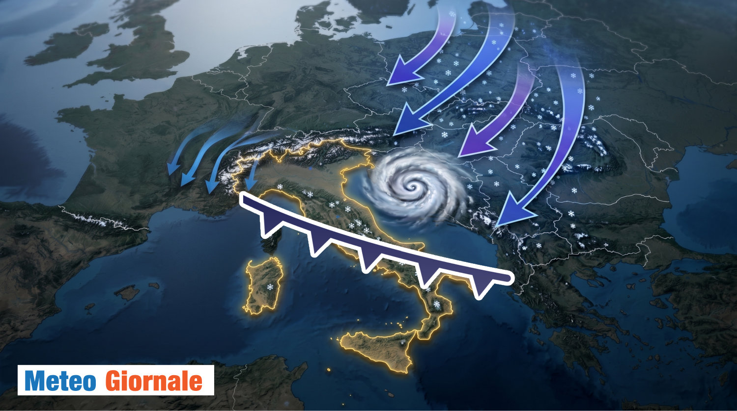 L’aria fredda, secondo il GFS, porterebbe addirittura nevicate in pianura su Polonia, Ungheria, Repubblica Ceca, Slovacchia e in alcune aree della Romania. Poi, molto vicino all’Italia, parliamo di Serbia, Croazia e Montenegro. Nevicate sparse sono attese anche sui rilievi italiani, soprattutto del settore adriatico, che risultano particolarmente vulnerabili durante questo tipo di circolazione atmosferica: se transiterà questo minimo di bassa pressione, avremo anche fenomeni di stau e quindi precipitazioni.