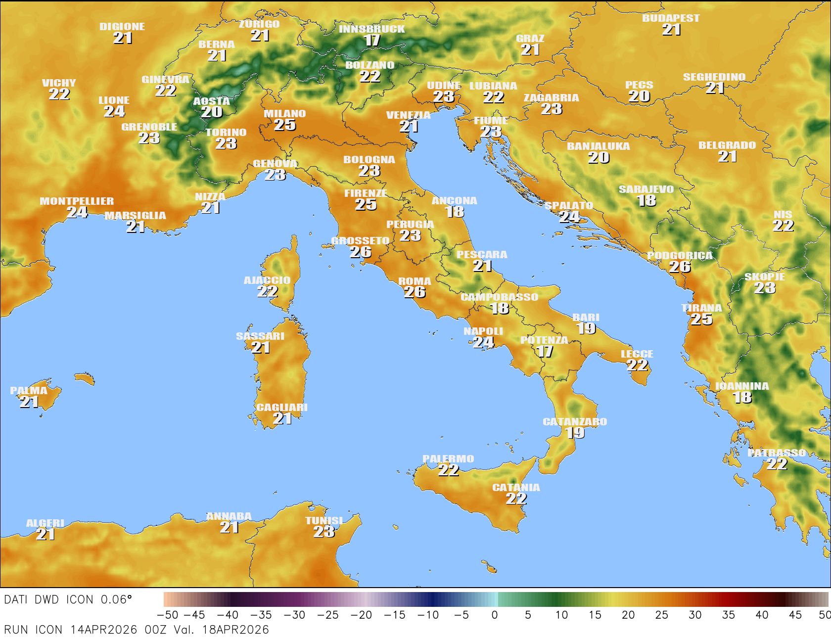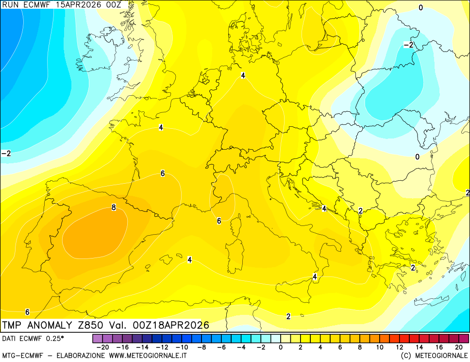 A circa 1500 metri sul livello del mare – equivalente a 850 hPa – sono previste per il 18 aprile anomalie positive tra +4°C e +6°C rispetto alla media del periodo. Nelle pianure del Nord Italia si attendono picchi di 25°C, mentre al Centro-Sud si potranno raggiungere 28°C, con punte occasionali sino a 30°C, accompagnate da condizioni di bel tempo. Una primavera davvero avanzata, considerando che siamo appena a metà mese. Ma vivendo in un mondo dove il Riscaldamento Globale ha alzato la baseline termica, non c’è più da meravigliarsi di tali anomalie.