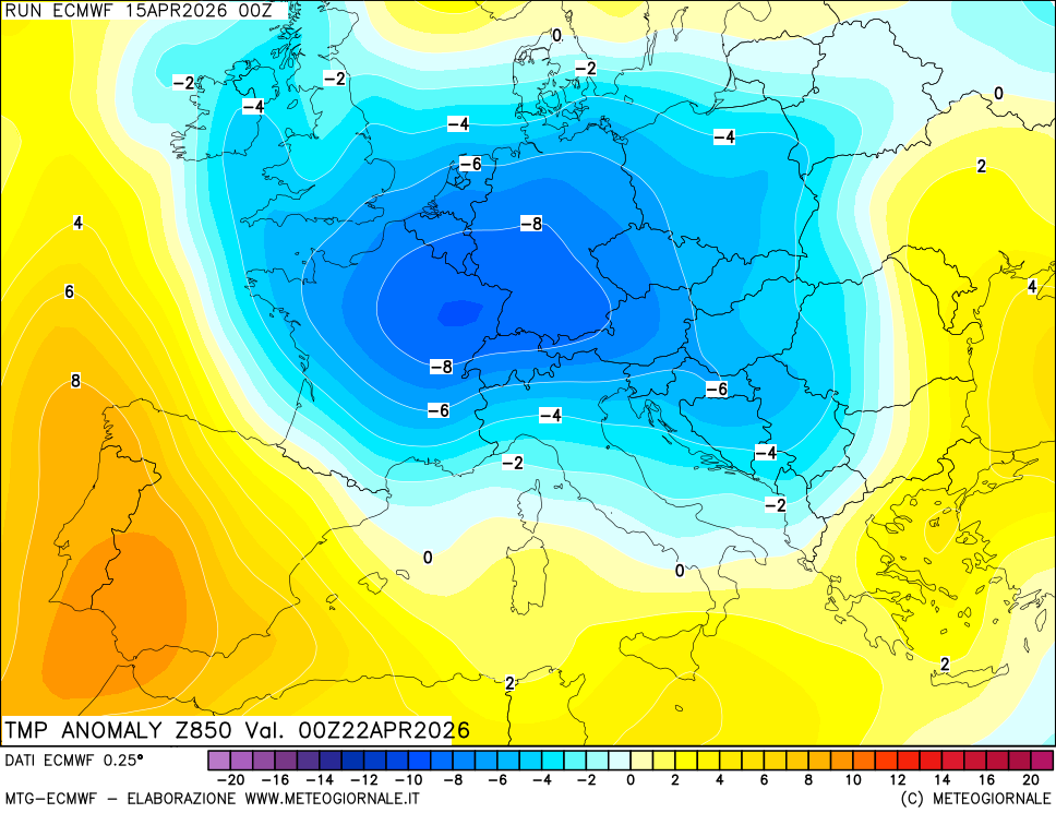 Al 22 aprile, con la piena espansione del Vortice Polare, le anomalie raggiungono -8°C rispetto alla media sull’Europa centrale, colpendo maggiormente la Francia, la Germania meridionale e la Svizzera settentrionale. In Francia si osserva addirittura un nucleo con un’anomalia di -10°C sotto la norma. Il nord Italia registra un’anomalia di circa -4°C in Pianura Padana, mentre nella regione alpina il valore scende fino a -6°C sotto la media stagionale. Un crollo termico più marcato sarà quello sui monti, dove il ricambio d’aria avviene con maggiore rapidità. Sull’Italia peninsulare, l’isoterma di 0°C a 850 hPa raggiunge la Campania e abbraccia anche la Puglia.