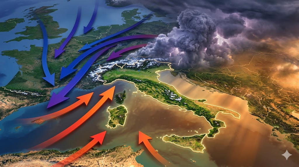 Masse d’aria caldissima, cariche di energia e umidità, collidono con sacche di aria molto fredda in discesa dal Polo, determinando un’instabilità atmosferica esplosiva. Ovviamente non solo in Italia, ma in tutte le zone coinvolte da questa dicotomia termica.