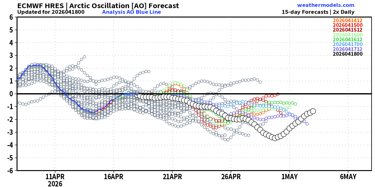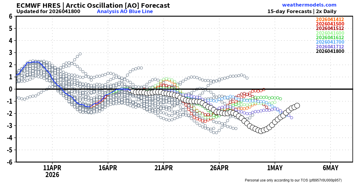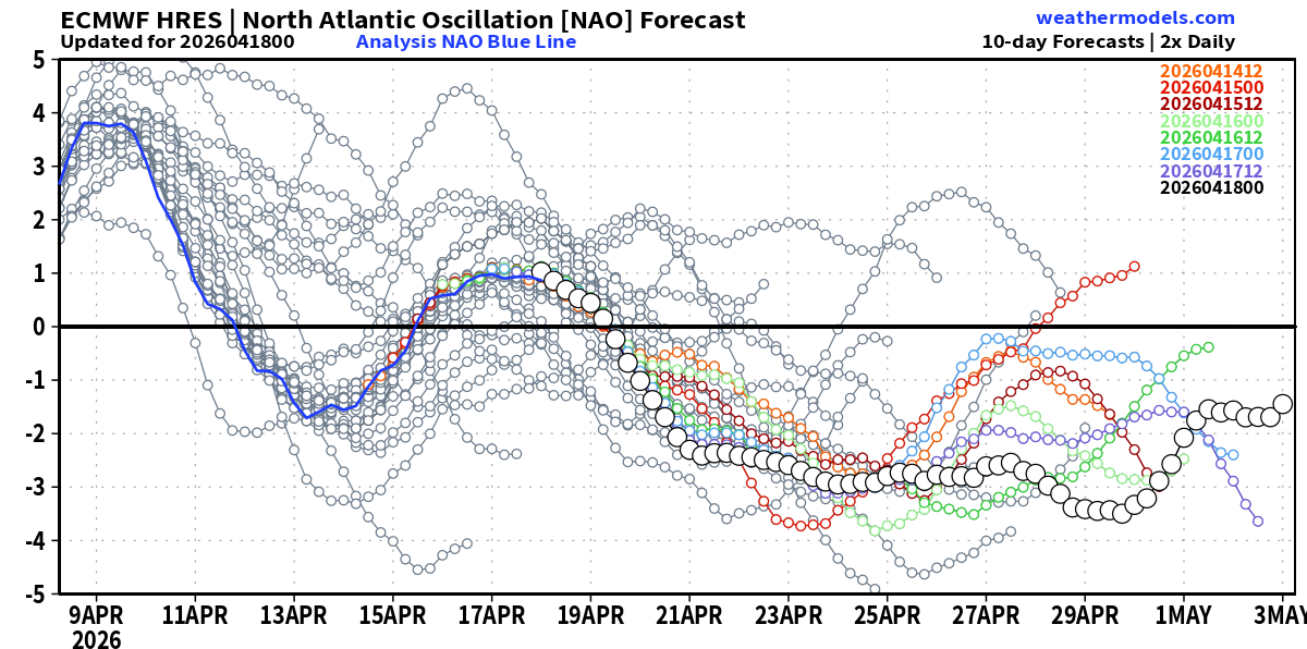 L’analisi emessa il 18 aprile 2026 mostra un indice AO che, partito in un campo positivo ai primi del mese (attorno a +2), ha già imboccato la parabola discendente ed è ora destinato – secondo la corsa ufficiale del modello matematico ECMWF HRES – a puntare verso quota -3, se non oltre, tra fine aprile e primi di maggio. Parallelamente, l’indice NAO conferma un crollo altrettanto deciso: dal picco positivo di circa +3,8 toccato a inizio mese, il modello matematico europeo ECMWF traccia una traiettoria nettamente negativa, con valori attesi fino a circa -3 e conferme corroboranti anche da parte della maggior parte dei membri del cluster ensemble.