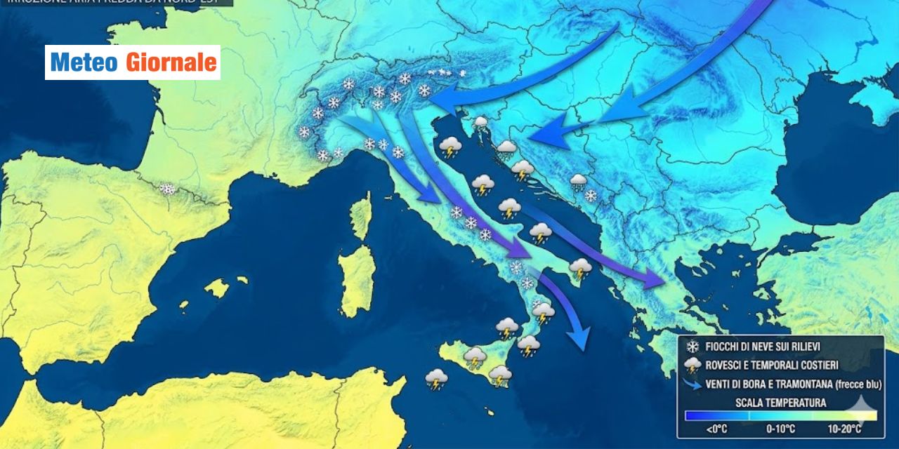 Il protagonista assoluto di questo marcato peggioramento sarà il vento di Bora, le cui correnti fredde inizieranno a farsi sentire con insistenza dapprima sulle regioni settentrionali, per poi scivolare rapidamente lungo tutto il versante adriatico – tradizionalmente le zone più esposte a questo tipo di venti. Analizziamo la questione attraverso il modello GFS. Nello specifico, intorno ai 1.500 metri di altitudine, le temperature subiranno un vero e proprio crollo, anche di una decina di gradi rispetto al caldo del weekend.