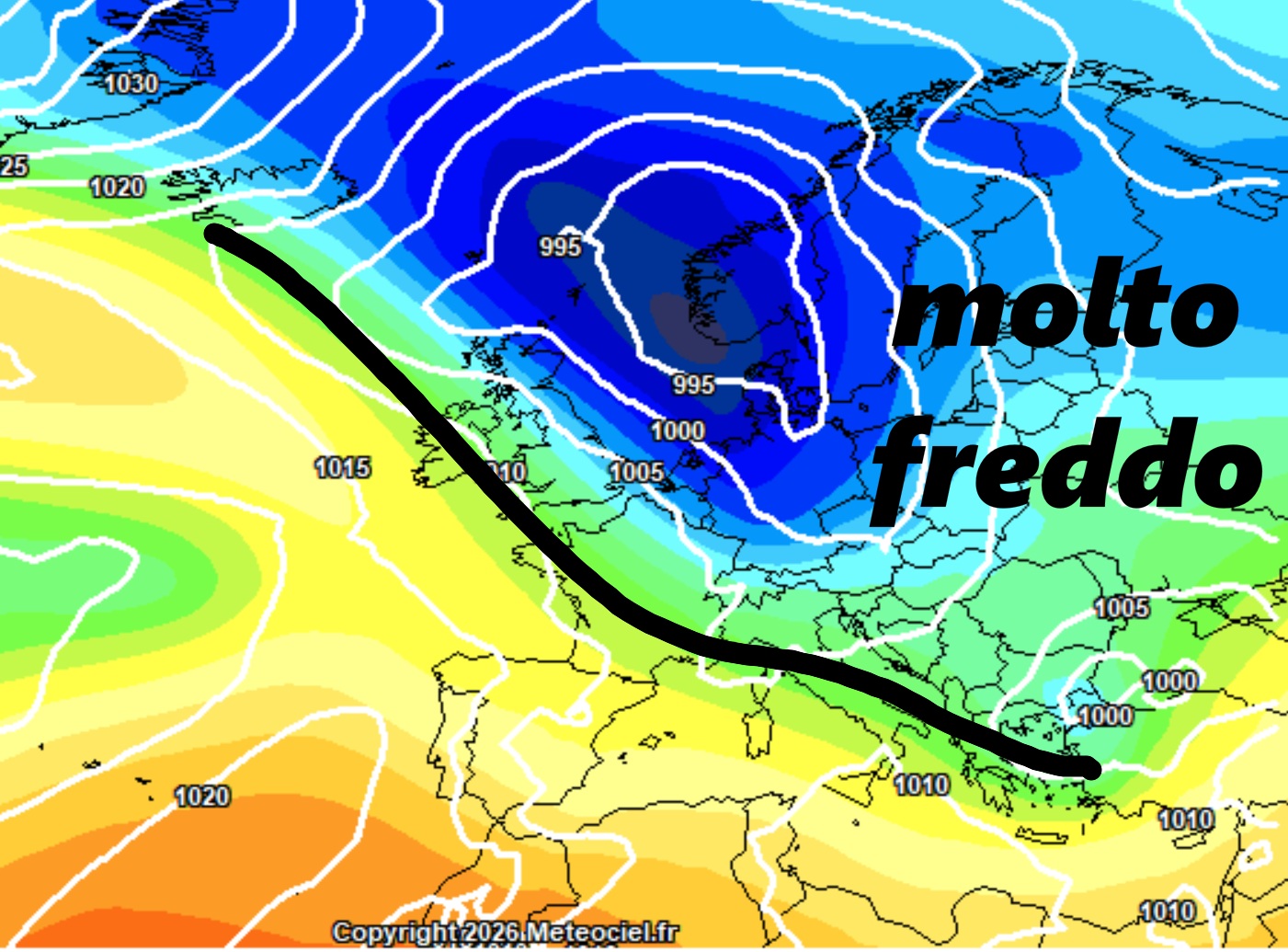 È chiaro che l’alta pressione di matrice africana rappresenta la vera protagonista delle lunghe fasi di bel tempo. In questo caso, tuttavia, non riuscirà a posizionarsi in modo deciso sul cuore del Mediterraneo. La sua roccaforte principale, infatti, rimarrà confinata e decisamente più defilata verso il settore occidentale, estendendo i suoi massimi barici sull’Iberia e verso il Regno Unito.